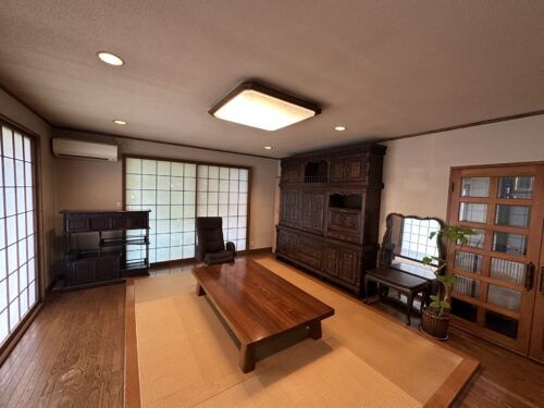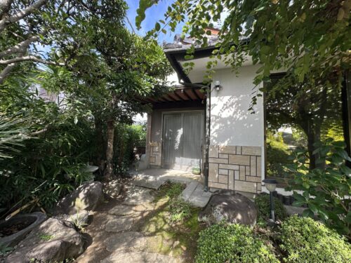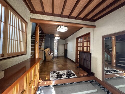日本庭園のある高級感あふれる木造住宅。庭園ある住戸では時の流れもゆったりとすすみます。竜王駅まで徒歩6分と好立地。シャッター付き駐車場と事務所、倉庫もある唯一無二の不動産です。是非見学にお越しください。